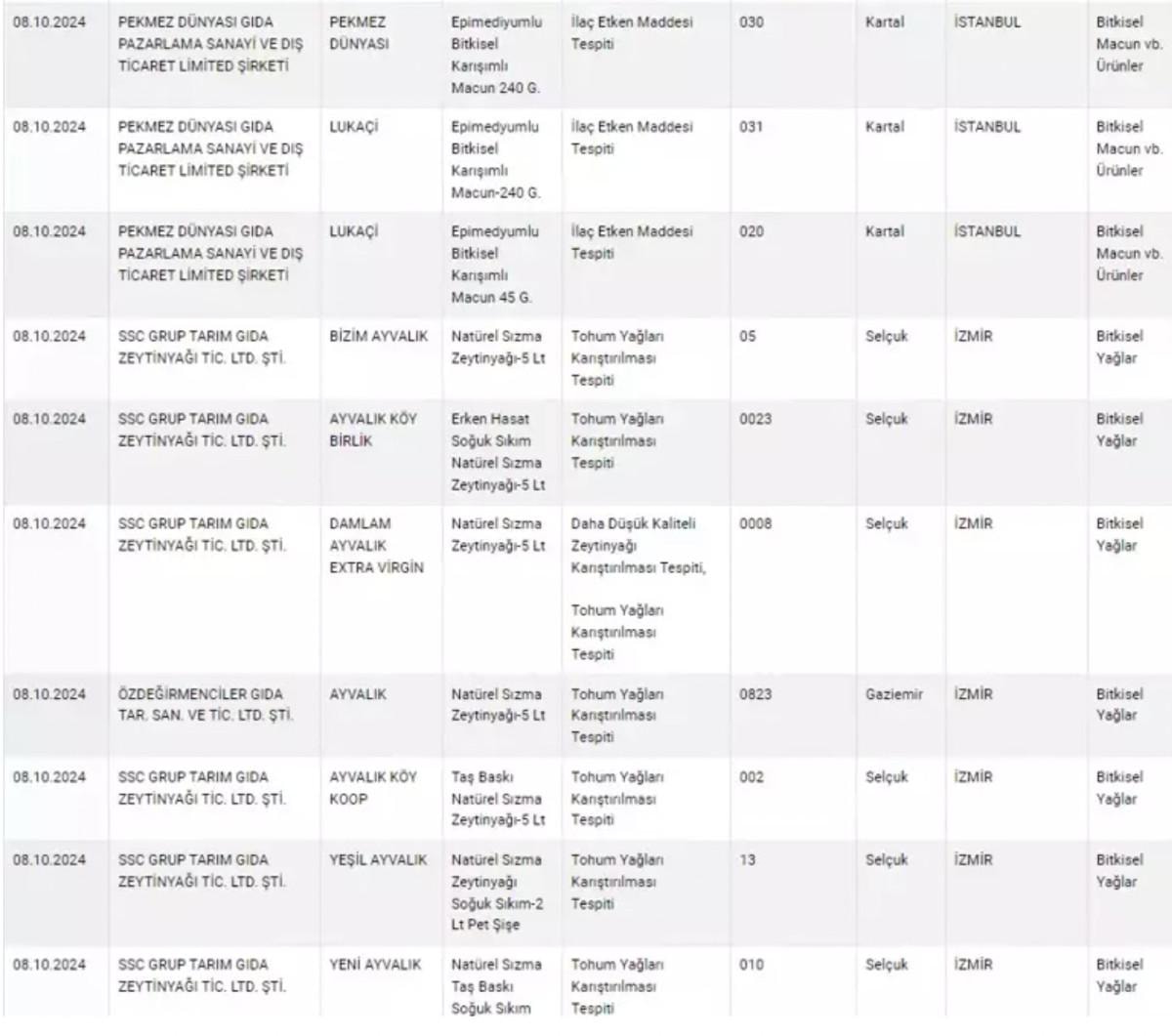 Listedeki güncellenmeye göre, Pekmez Dünyası firmasının ürettiği "ballı bitkisel padişah macunu"nda ve "240 gram paketli epimediyumlu bitkisel karışımlı macun"da ilaç etken maddesi tespit edildi.