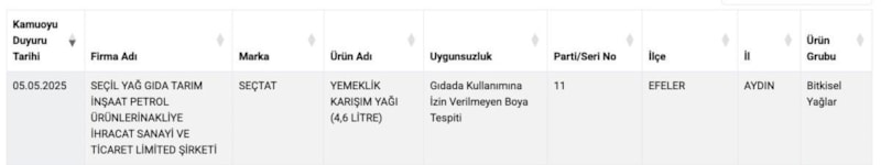 Aydın ilinin Efeler ilçesinde faaliyet gösteren Seçil Yağ Gıda Tarım İnşaat Petrol Ürünleri Nakliye İhracat Sanayi ve Ticaret Limited Şirketi, Seçtat markalı yemeklik karışım yağda (4,6 litre), gıdada kullanımına izin verilmeyen boya tespit edildi.