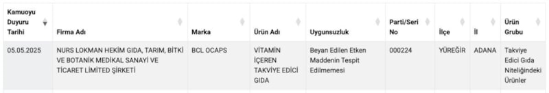 Adana ilinin Yüreğir ilçesinde Nurs Lokman Hekim Gıda, Tarım, Bitki ve Botanik Medikal Sanayi ve Ticaret Limited Şirketi BCL Ocaps markalı vitamin içeren takviye edici gıdada, beyan edilen etken maddenin tespit edilmemesi taklidine rastlandı.