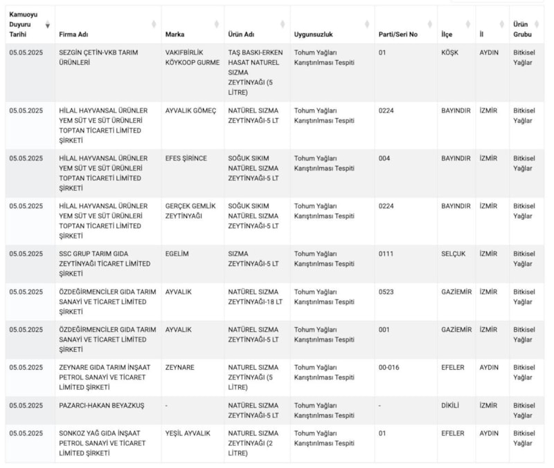 Bu listede de aracılık ürünlerinde taklit ve tağşiş tespiti yapıldı. Zeytinyağlarına tohum yağlar karıştırıldı.