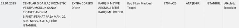 Listede İstanbul'un Ataşehir ilçesinde faaliyet gösteren Centuar firmasının, karışık meyve aromalı bitki karışımlı içeceğe ilaç etken maddesi kattığı belli oldu.