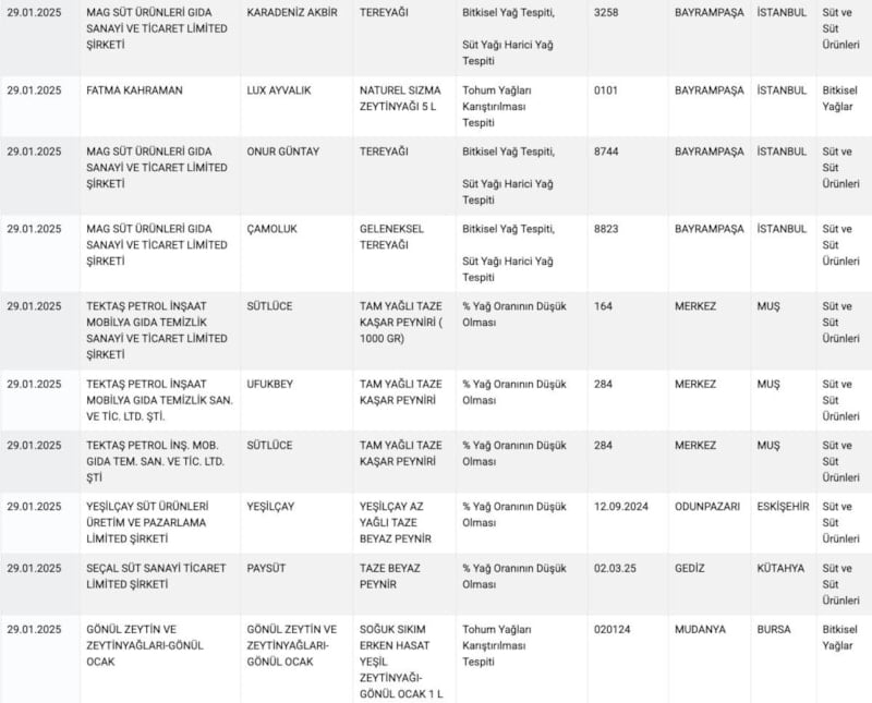Taklit ve tağşiş listesine giren ürünler bu kez bitkisel yağlar ve süt ürünlerinden oluştu.