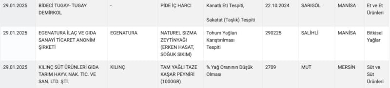Bu listelerde daha önce et ve sucukta tık tırnaklı eti, köftede domuz eti, sütte su, peynirde natamisin, baharatta boya maddeleri çıktı.