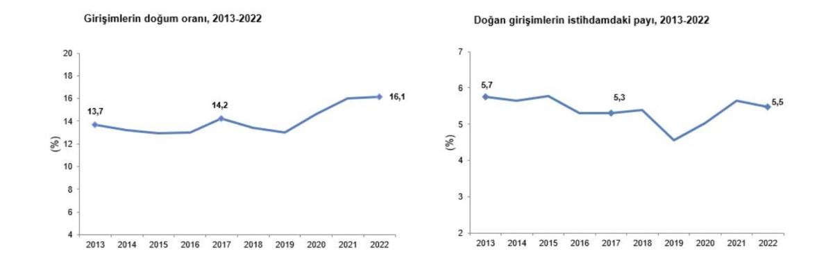 Girişimlerin 2021 yılındaki doğum oranı yüzde 16 ve bu girişimlerin istihdamdaki payı yüzde 5,6 iken, 2022 yılında doğum oranı yüzde 16,1'e yükselirken, istihdam payı ise yüzde 5,5'e geriledi