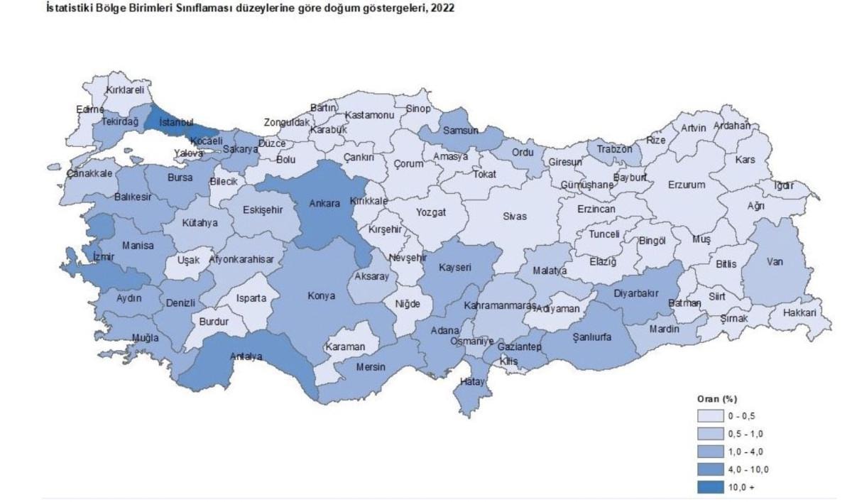 İllere göre 2022 doğan girişimlerden en yüksek payı yüzde 26,8 ile İstanbul aldı. İstanbul'u sırasıyla yüzde 7,4 ile Ankara ve yüzde 6,2 ile İzmir takip etti.