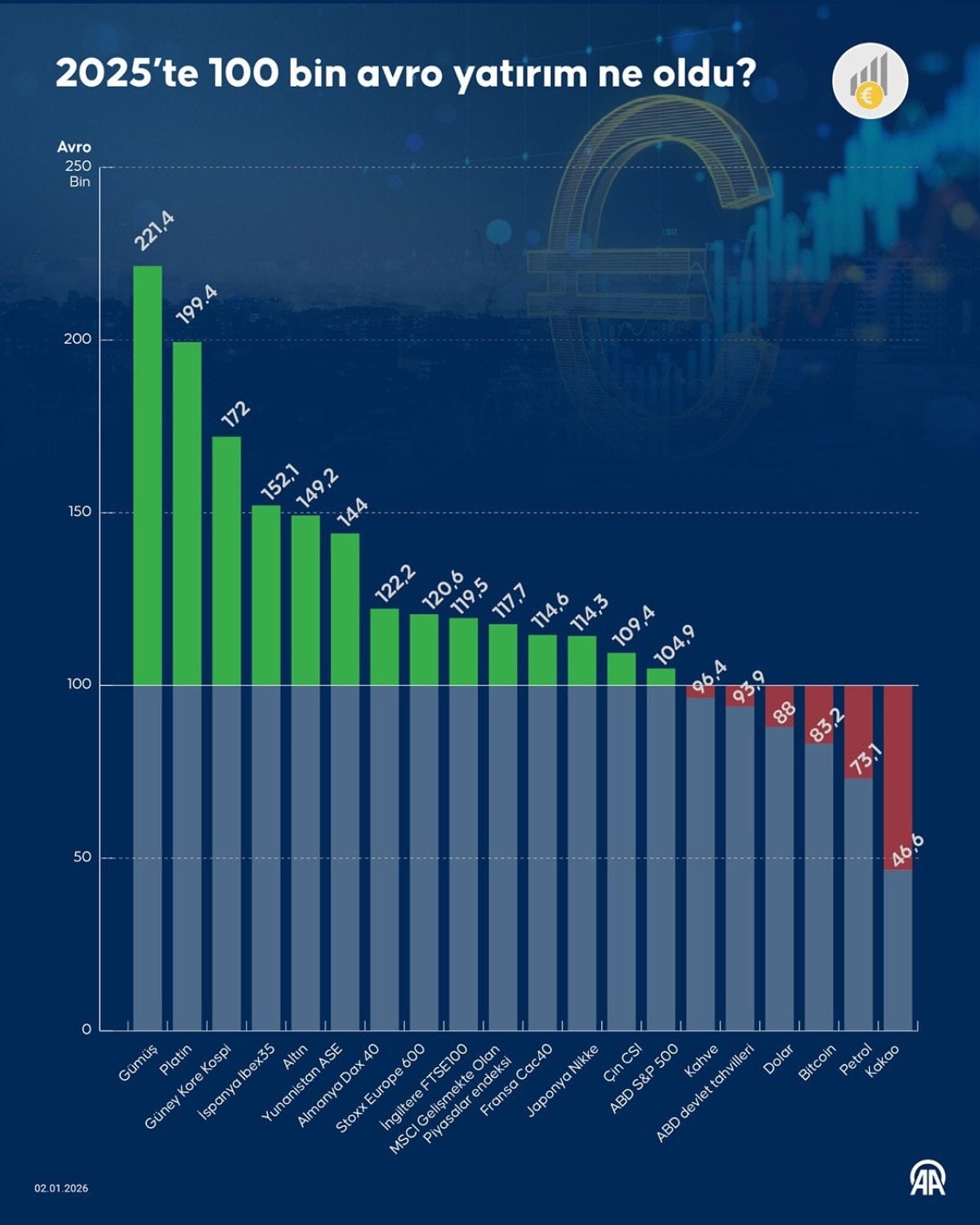 2025 yılında 100 bin euroluk yatırımın performansı incelendiğinde, en fazla kazandıran yatırım aracı gümüş oldu.