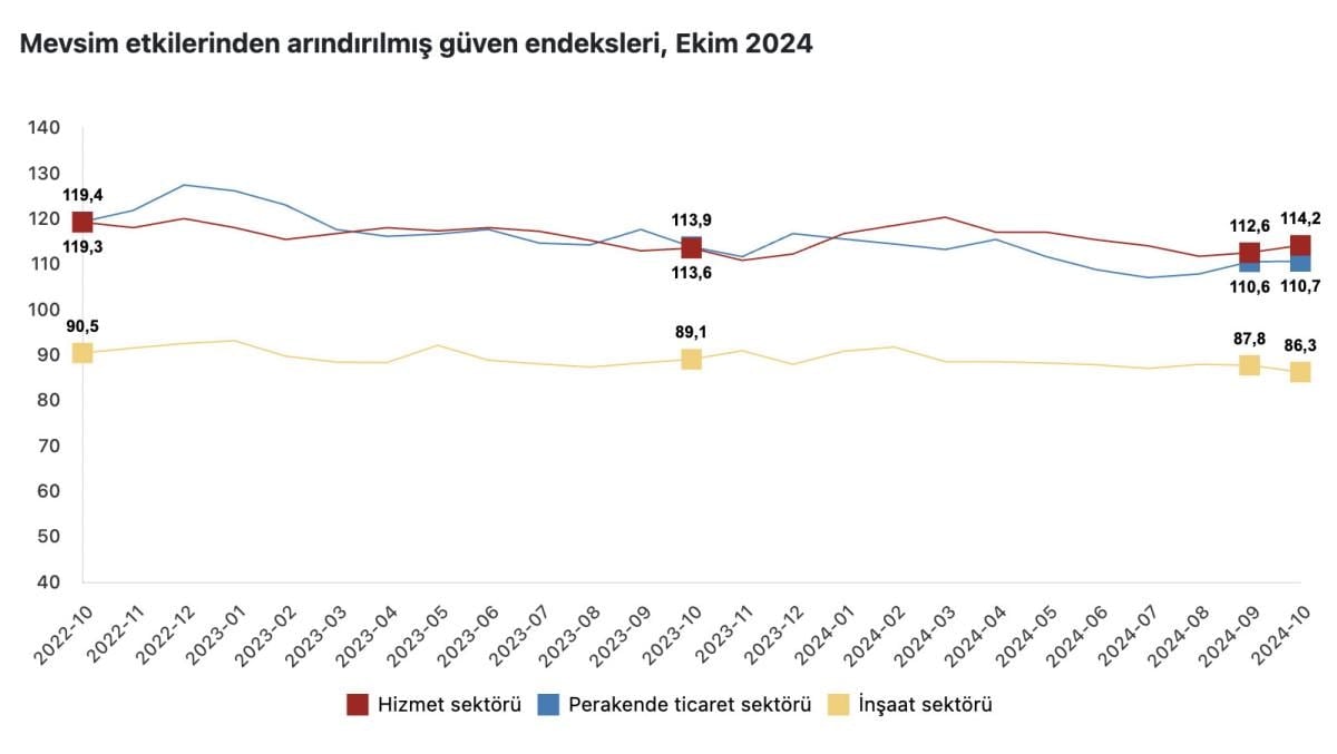 Buna göre, mevsim etkilerinden arındırılmış güven endeksi, ekimde aylık bazda hizmet sektöründe yüzde 1,5 artarak 114,2, perakende ticaret sektöründe yüzde 0,1 yükselişle 110,7 olurken inşaat sektöründe yüzde 1,7 azalışla 86,3 değerini aldı.