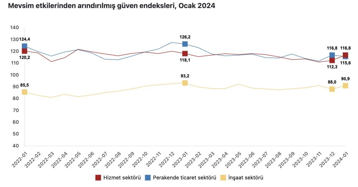 Mevsim etkilerinden arındırılmış güven endeksi ocak ayında, bir önceki aya göre hizmet sektöründe yüzde 4,0 oranında artarak 116,8 değerini aldı.
