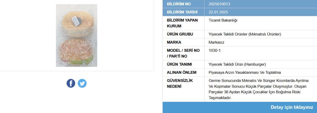 Bu portala son eklenen ürüne bakıldığında Yiyecek Taklidi Ürünlerin (Mıknatıslı Ürünler) germe sonucunda mıknatıs ve sünger kısımlarda ayrılma ve kopmalar sonucu küçük parçalar oluştuğu bildirilmiş.