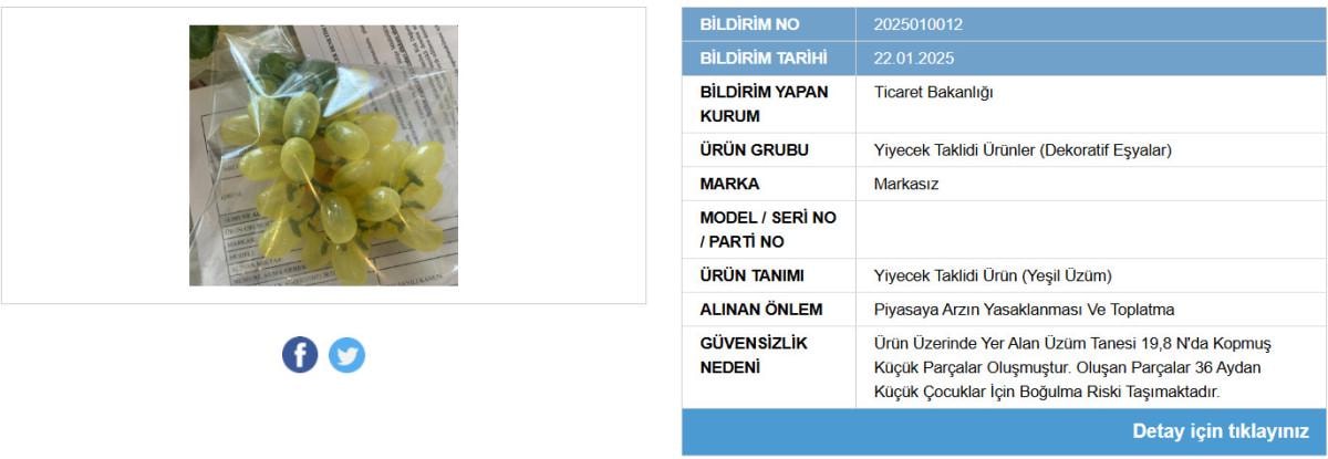 Bir diğer yiyecek taklidi ürünlerin (Dekoratif Eşyalar) üzerinde yer alan üzüm taneleri kopmuş küçük parçalardan oluştuğu için yine 36 aydan küçük çocuklar için boğulma riski taşıdığı bilgisi veriliyor.