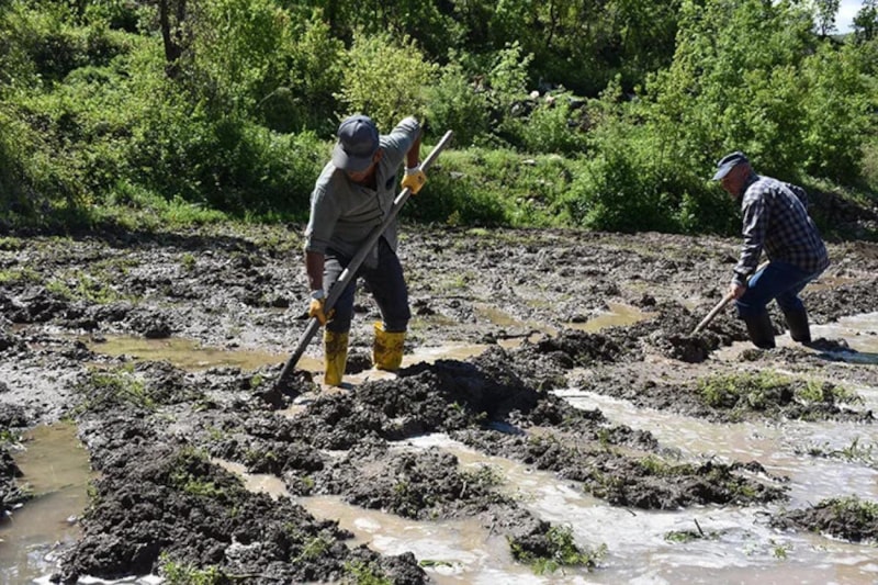 Gün boyunca sulayarak toprağının çamur haline gelmesini sağladıkları tarlada el birliğiyle havuzlar oluşturuyor.