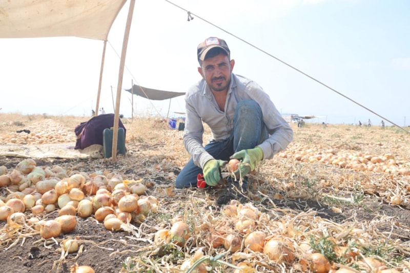 Soğan hasadının bereketli olduğunu fakat tarla fiyatının 5 TL olmasının çiftçiyi olumsuz etkilediğini ifade eden işçibaşı Süleyman Budak, "Biz burada soğan hasadı yapıyoruz. Burası 100 dönümlük bir soğan tarlası. Hasat bu yıl çok iyi ama fiyatlar bu yıl kırık oldu. Soğan tarlada 5 ila 6 TL iken büyük marketlerde 20 ila 25 TL civarında fiyatı oluyor. Hasadın ilk zamanlarında fiyatı 8 ila 12 iken fiyatlar düştü. Biz yükselmesini beklerken fiyatlarda düşüş oldu. Havalar çok sıcak 40 dereceye geçiyor. Amik Ovası'nda 40 dereceye geçen sıcaklıklara rağmen soğan hasadı yapıyoruz. Bu sıcaklıklar altında çalışıyoruz.