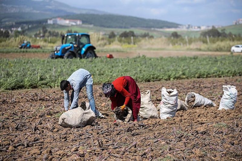 Depremlerden bir süre sonra yeniden tarım arazilerinin yolunu tutmaya başlayan işçiler, tarlalarda topladıkları havuçları çuvallara dolduruyor.