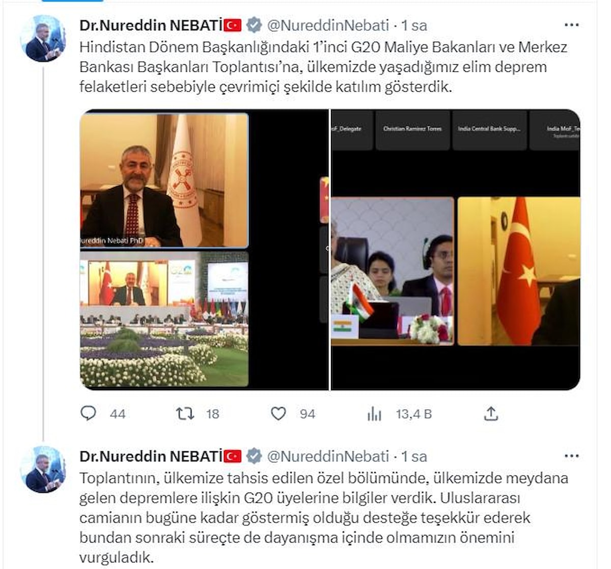 Bakan Nebati, Twitter'dan yayınladığı mesajında 1’inci G20 Maliye Bakanları ve Merkez Bankası Başkanları Toplantısı’na, deprem felaketleri sebebiyle çevrimiçi şekilde katılım gösterildiğini belirtti.
