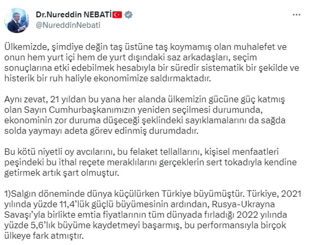 Hazine ve Maliye Bakanı Nureddin Nebati, muhalefetin şimdiye dek taş üstüne taş koymadığı halde, seçim sonuçlarına etki edebilmek hesabıyla bir süredir sistematik bir şekilde ve histerik bir ruh haliyle ekonomiye saldırdığını belirten düşüncelerini, yayınladığı mesajla aktardı.