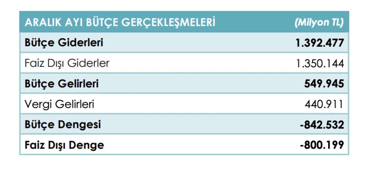 Hazine ve Maliye Bakanlığı, aralık ayına ilişkin merkezi yönetim bütçe istatistiklerini aktardı.