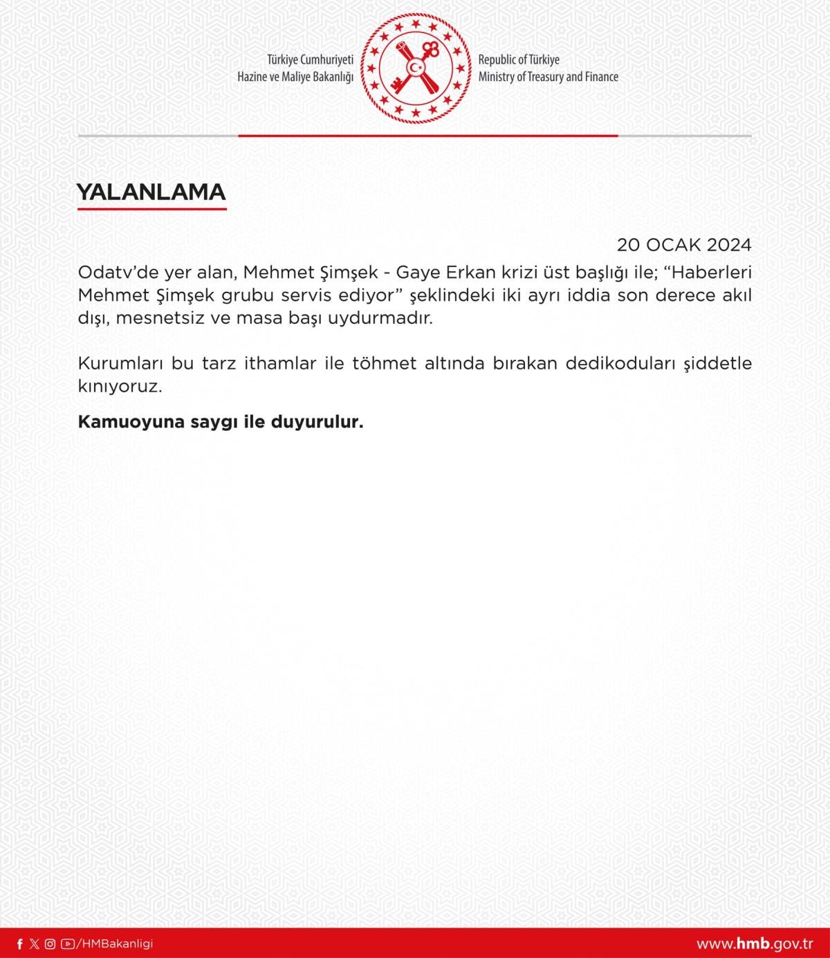 Hazine ve Maliye Bakanlığı'nın kamuoyuna yaptığı "yalanlama" açıklaması şöyle: