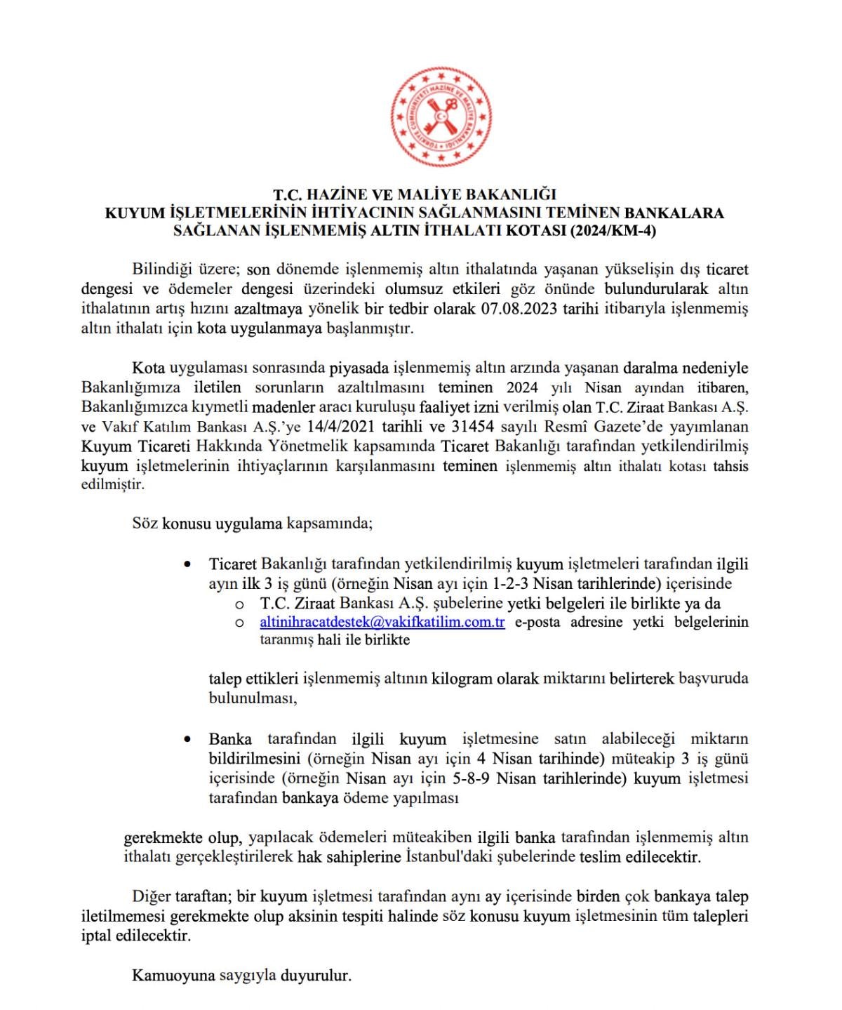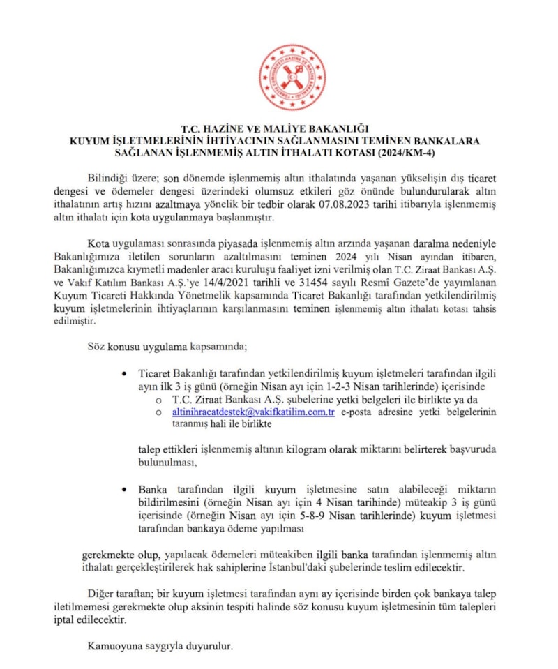 Kota uygulaması sonrasında piyasada işlenmemiş altın arzında yaşanan daralma nedeniyle Bakanlığımıza iletilen sorunların azaltılmasını teminen 2024 yılı Nisan ayından itibaren, Bakanlığımızca kıymetli madenler aracı kuruluşu faaliyet izni verilmiş olan T.C. Ziraat Bankası A.Ş. ve Vakıf Katılım Bankası A.Ş.’ye 14/4/2021 tarihli ve 31454 sayılı Resmî Gazete’de yayınlanan Kuyum Ticareti Hakkında Yönetmelik kapsamında Ticaret Bakanlığı tarafından yetkilendirilmiş kuyum işletmelerinin ihtiyaçlarının karşılanmasını teminen işlenmemiş altın ithalatı kotası tahsis edilmiştir.