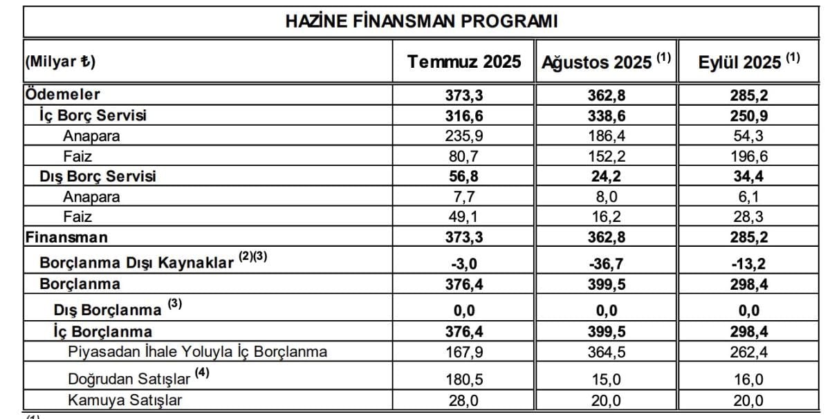 Temmuzda 373,3 milyar lira, ağustosta 362,8 milyar lira ve eylülde 285,2 milyar lira ödeme yapılacak. Bu ödemelerin 115,4 milyar lirası dış borç servisinden oluşacak.