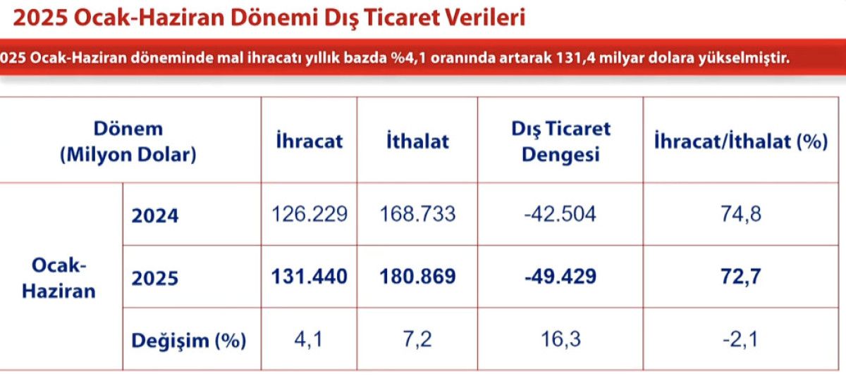 2025'in ilk yarısında dış ticaret açığı, bir önceki yılın aynı dönemine kıyasla yüzde 16,3 oranında artışla 49,4 milyar dolar oldu
