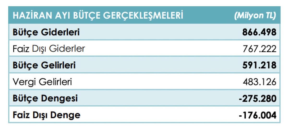 Merkezi yönetim bütçe giderleri Haziran ayı itibarıyla 866 milyar 498 milyon TL olarak gerçekleşmiştir. Faiz harcamaları 99 milyar 277 milyon TL, faiz hariç harcamalar ise 767 milyar 222 milyon TL olarak gerçekleşmiştir.