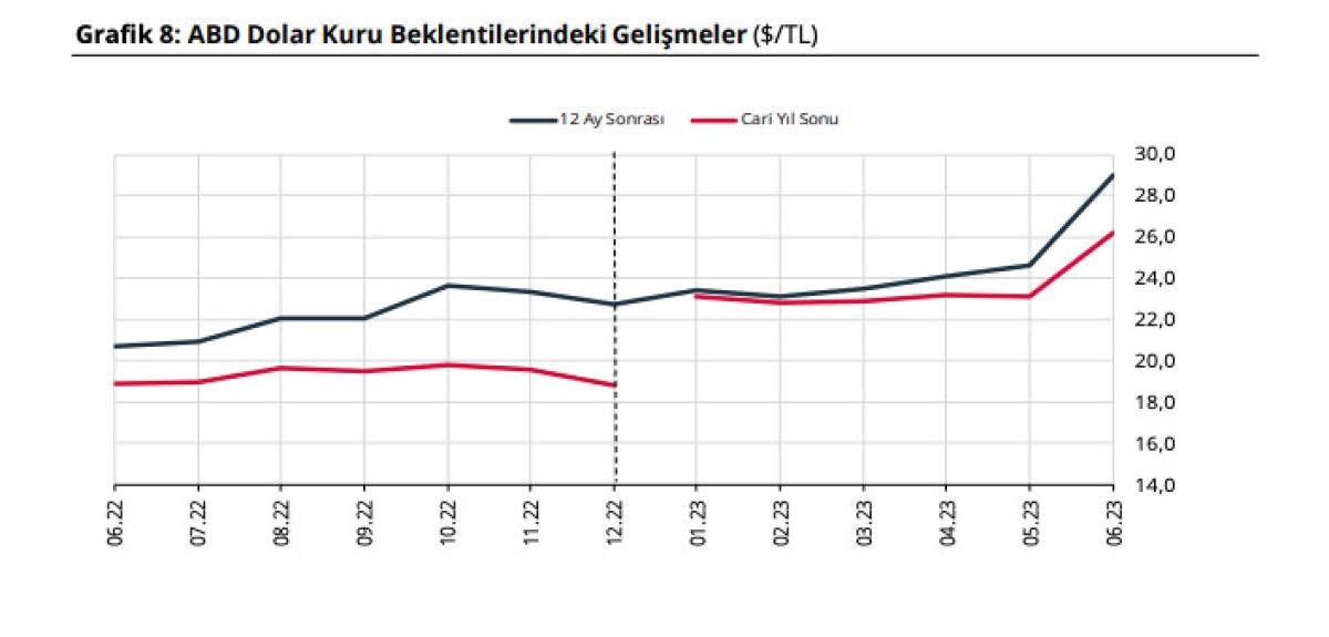 Dolar beklentisi 23,09 TL iken, bu anket döneminde 26,18 TL'ye çıktı.