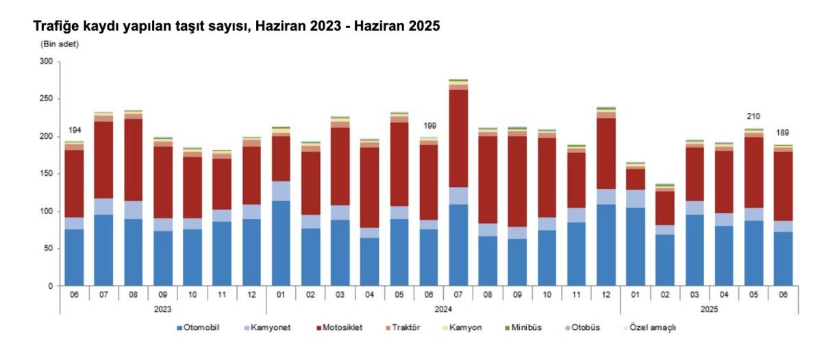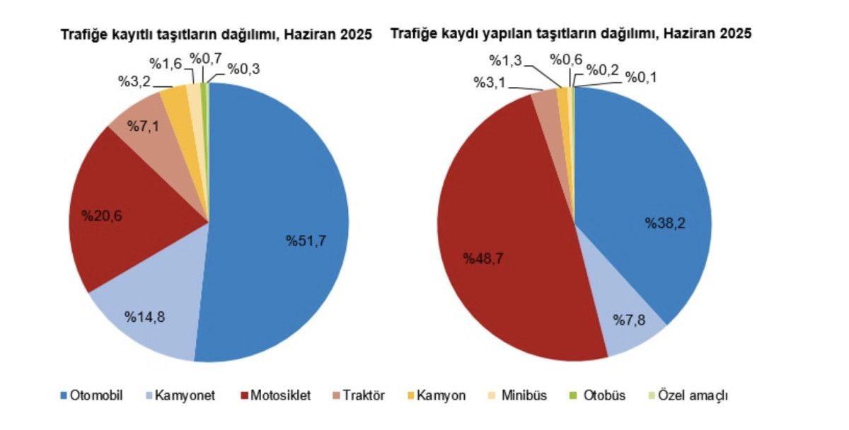 Haziran ayında trafiğe kaydı yapılan taşıtların yüzde 48,7'sini motosiklet, yüzde 38,2'sini otomobil, yüzde 7,8'ini kamyonet, yüzde 3,1'ini traktör, yüzde 1,3'ünü kamyon, yüzde 0,6'sını minibüs, yüzde 0,2'sini otobüs ve yüzde 0,1'ini özel amaçlı taşıtlar oluşturdu.