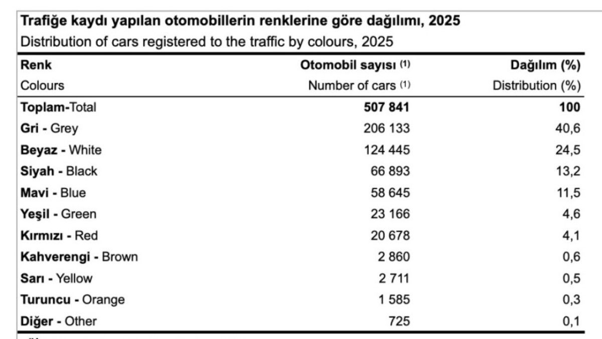 Ocak-Haziran döneminde trafiğe kaydı yapılan 507 bin 841 adet otomobilin yüzde 40,6'sı gri, yüzde 24,5'i beyaz, yüzde 13,2'si siyah, yüzde 11,5'i mavi, yüzde 4,6'sı yeşil, yüzde 4,1'i kırmızı, yüzde 0,6'sı kahverengi, yüzde 0,5'i sarı, yüzde 0,3'ü turuncu ve yüzde 0,1'i diğer renklidir. Böylece 6 ayda kaydı yapılan otomobillerin 206 bin 133'ü gri renkli oldu.