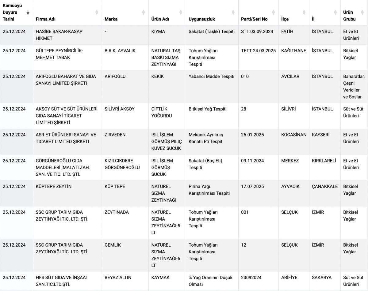 Denetimler ve incelemeler devam ettikçe Türkiye'nin dört bir yanından listeye giren ürün ve şehir sayısı artıyor.