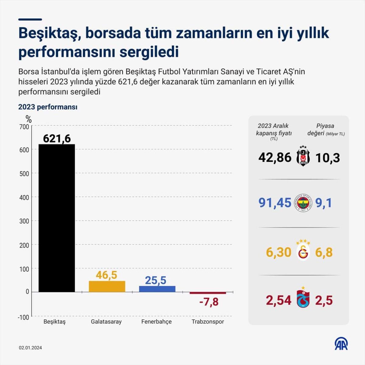 Borsa İstanbul'da işlem gören Beşiktaş Futbol Yatırımları Sanayi ve Ticaret AŞ'nin hisseleri, 2023 yılında yüzde 621,6 değer kazanarak tüm zamanların en iyi yıllık performansını sergiledi.