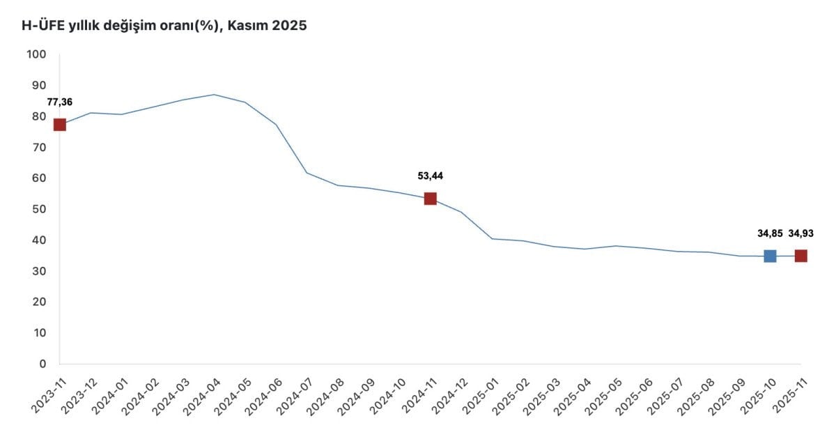 Buna göre H-ÜFE geçen ay, bir önceki aya kıyasla yüzde 0,7 düşüş gösterirken geçen yılın aralık ayına göre yüzde 34,07, geçen yılın aynı ayına kıyasla yüzde 34,93 ve 12 aylık ortalamalara göre yüzde 37,71 yükseldi.