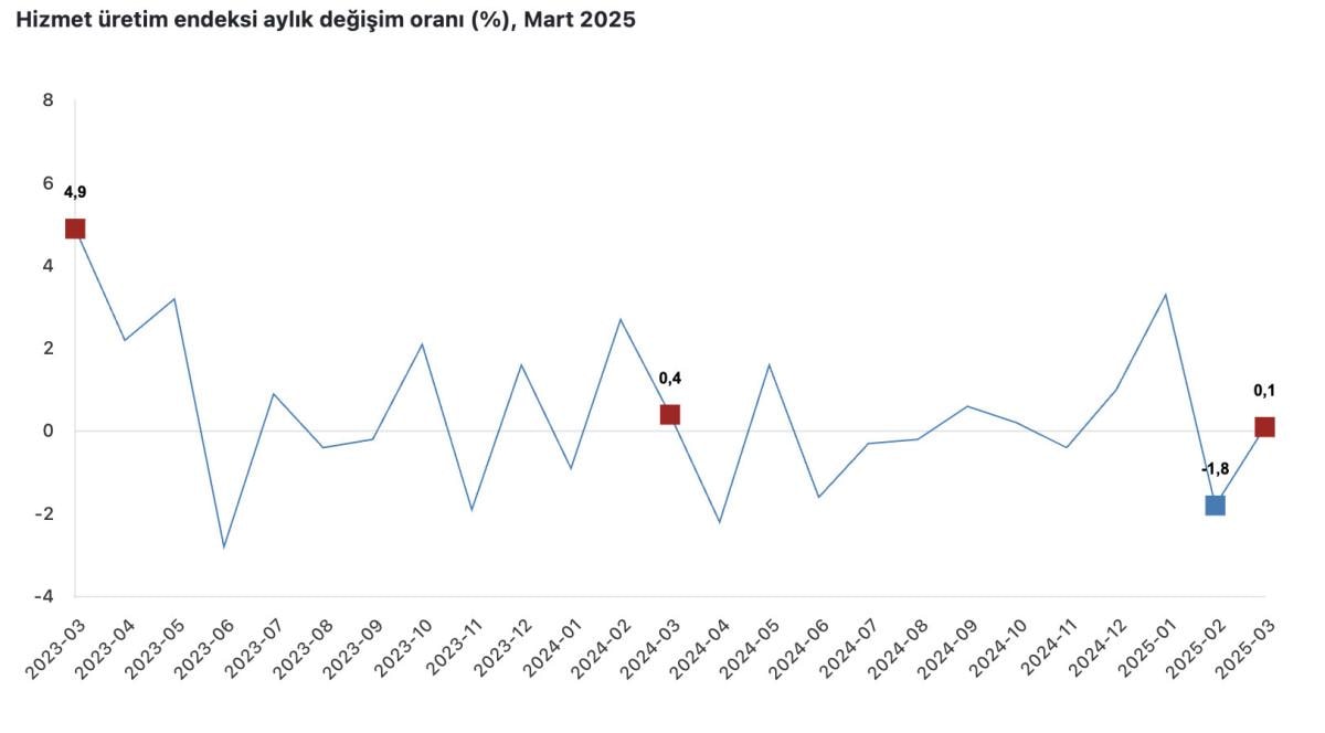 Hizmet üretim endeksi 2025 yılı Mart ayında, bir önceki yılın aynı ayına göre yüzde 0,4 arttı.