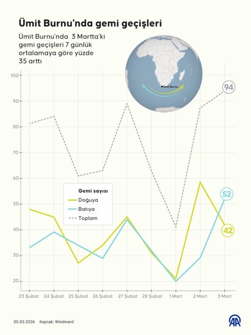 Windward verilerine göre, Ümit Burnu’ndan geçen transit gemi sayısı 2 Mart’ta bir önceki güne göre yüzde 112 artarak 87’ye yükseldi. 3 Mart’ta ise günlük yüzde 8 artışla 94 gemiye ulaştı.