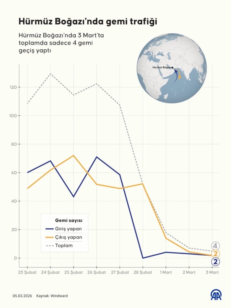 Gerçek zamanlı denizcilik takip sistemi Windward verilerine göre, boğazdan geçen gemi sayısı 2 Mart’ta 7’ye, 3 Mart’ta ise yalnızca 4’e düştü. Oysa tarihsel ortalamada boğazdan günlük yaklaşık 138 gemi geçiş yapıyordu. Böylece geçişler son günlerde yaklaşık yüzde 90 oranında azalmış oldu.