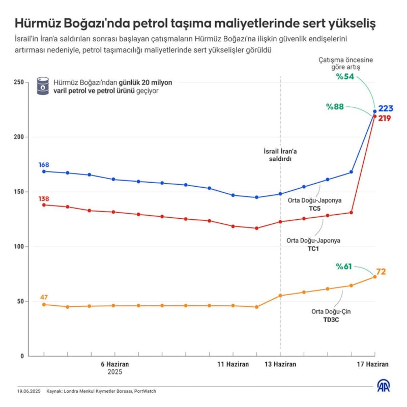 İsrail'in İran'a saldırıları sonrası başlayan çatışmaların Hürmüz Boğazı'na ilişkin güvenlik endişelerini artırması, petrol taşımacılığı maliyetine yansıdı.