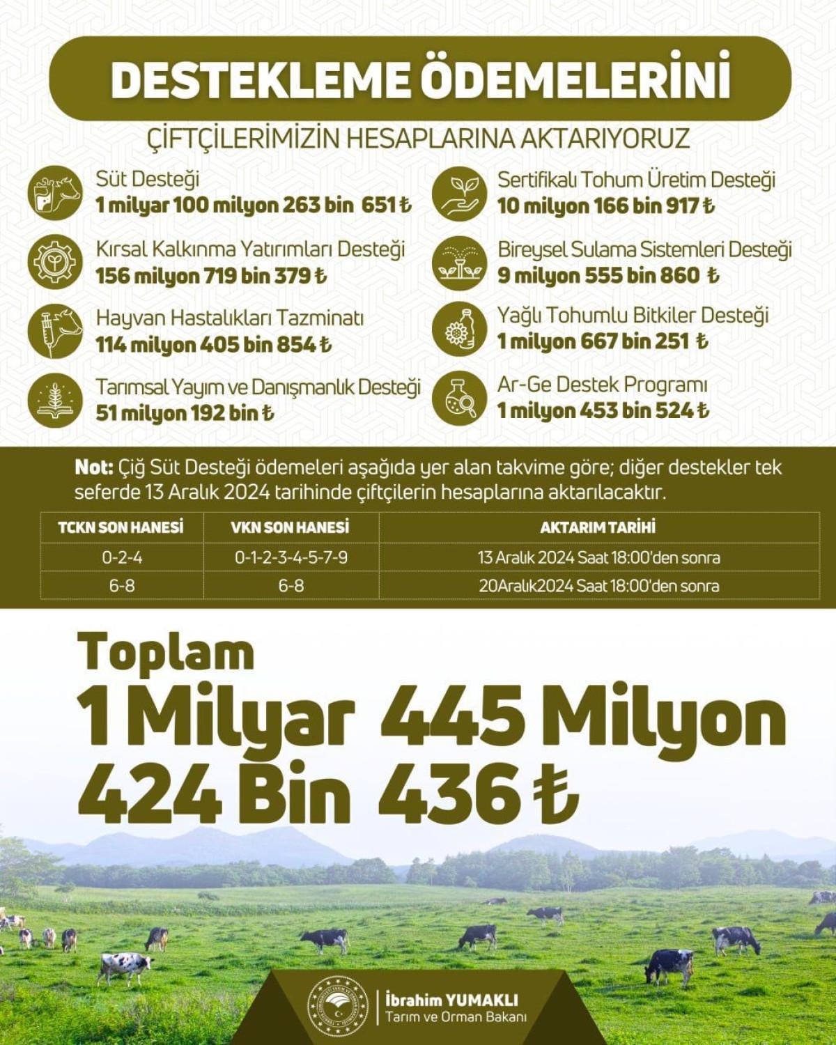 Toplam 1 milyar 445 milyon 424 bin TL tarımsal destekleme ödemesini bugün çiftçilerimizin hesaplarına aktarıyoruz.