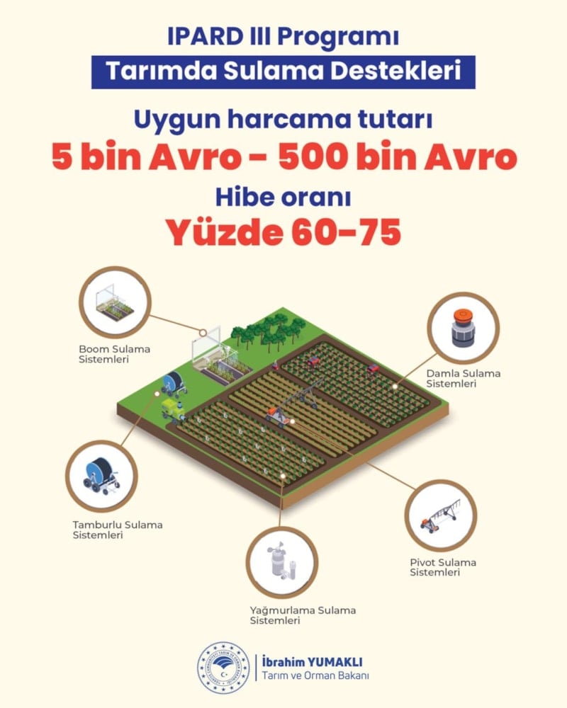 Tarım ve Orman Bakanı İbrahim Yumaklı, IPARD III Programı kapsamında sulama sistemlerine hibe verildiğini belirterek, "Bu kapsamda, 500 bin euroya kadar uygun harcamaların yüzde 75'ine kadar hibe desteği sağlıyoruz." ifadesini kullandı.