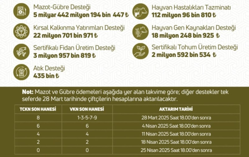 Paylaşımda yer alan bilgilere göre, destek tutarları, mazot ve gübre için 5 milyar 442 milyon 194 bin 447 lira, kırsal kalkınma yatırımları için 22 milyon 701 bin 971 lira, sertifikalı fidan üretimi için 3 milyon 957 bin 819 lira, hayvan hastalıkları tazminatı için 112 milyon 96 bin 810 lira, hayvan gen kaynakları için 18 milyon 248 bin 925 lira, sertifikalı tohum üretimi için 2 milyon 592 bin 534 lira, atık içinse 435 bin lira olarak belirlendi.
