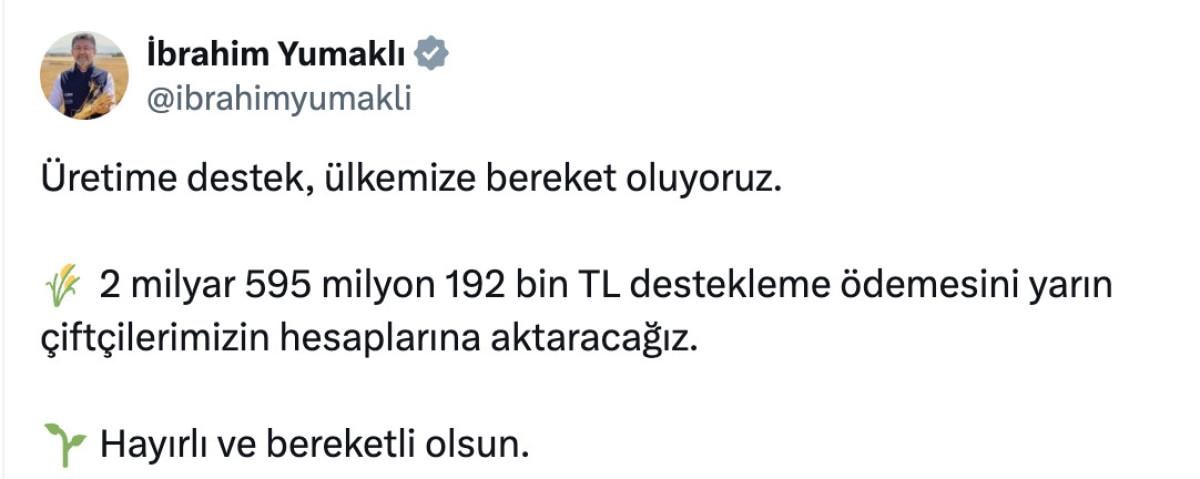 İbrahim Yumaklı'nın sosyal medya hesabından, tarımsal destekleme ödemelerine ilişkin yaptığı paylaşımda üretime destek, ülkeye bereket olduklarını belirterek, "2 milyar 595 milyon 192 bin TL destekleme ödemesini yarın çiftçilerimizin hesaplarına aktaracağız. Hayırlı ve bereketli olsun." ifadelerini kullandı.