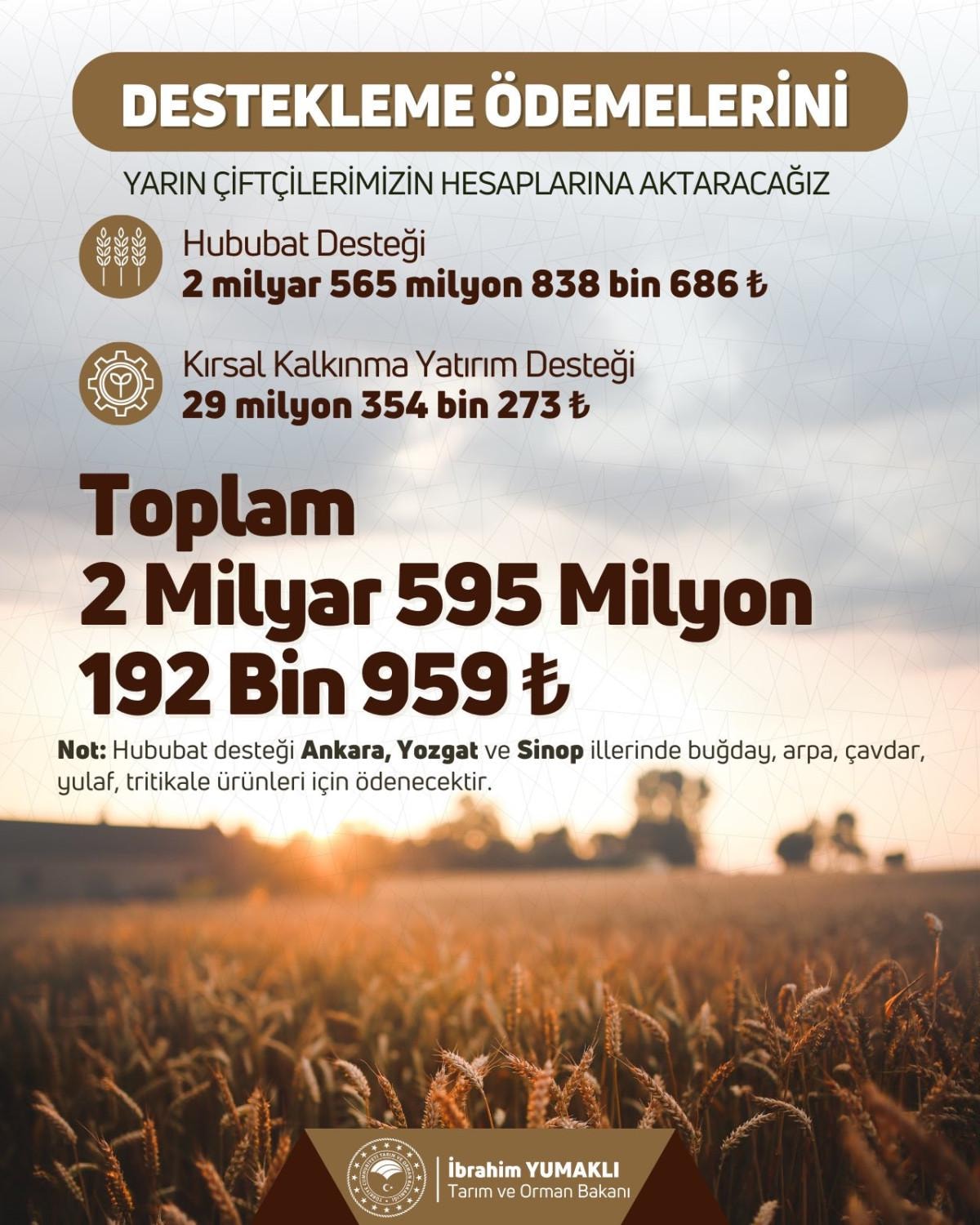 Tarım ve Orman Bakanı İbrahim Yumaklı, 2 milyar 595 milyon 192 bin TL destekleme ödemesinin yarın çiftçilerin hesabına yatırılacağını bildirdi.