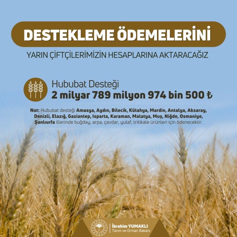 Yumaklı'nın paylaşımında yer alan bilgilere göre, söz konusu desteği tamamı hububat desteği kapsamında verilecek.