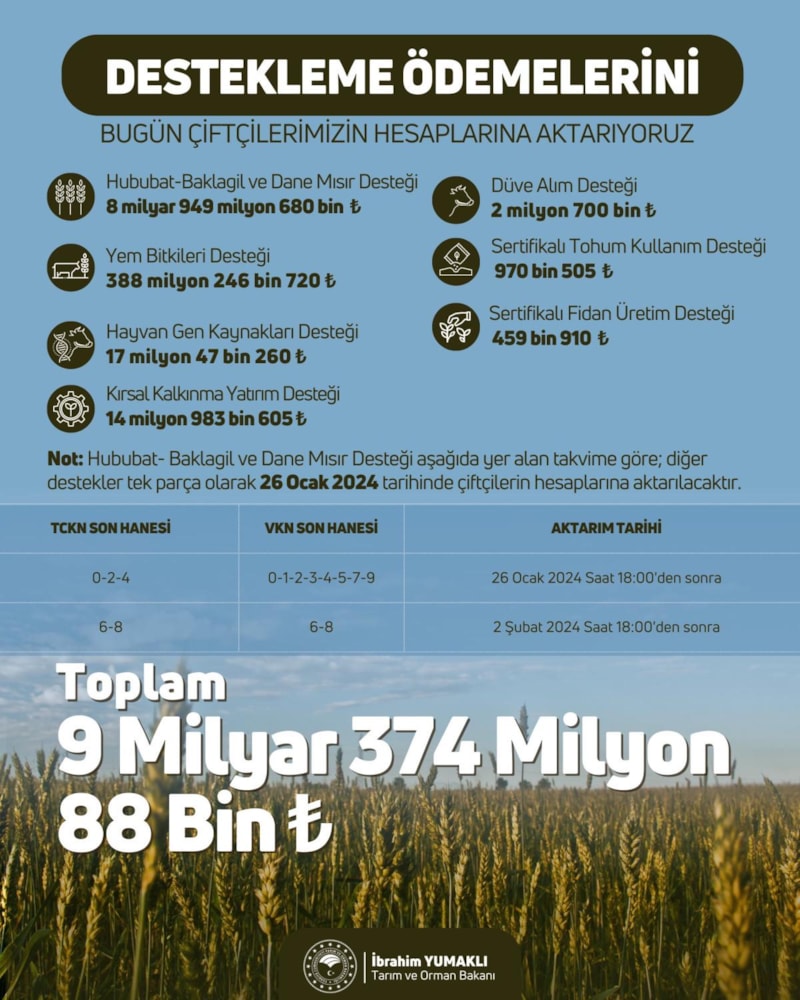 Tarım ve Orman Bakanı İbrahim Yumaklı, 9 milyar 374 milyon 88 bin lira tutarında tarımsal destekleme ödemesinin bugün çiftçilerin hesaplarına aktarılacağını duyurdu.