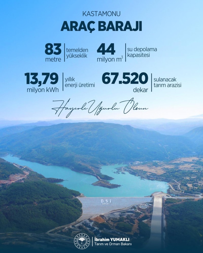 Tarım ve Orman Bakanı Yumaklı, bir mesaj yayınlayarak Kastamonu Araç Barajı ile suya kavuşacak tarım arazisinin büyüklüğünü aktardı.