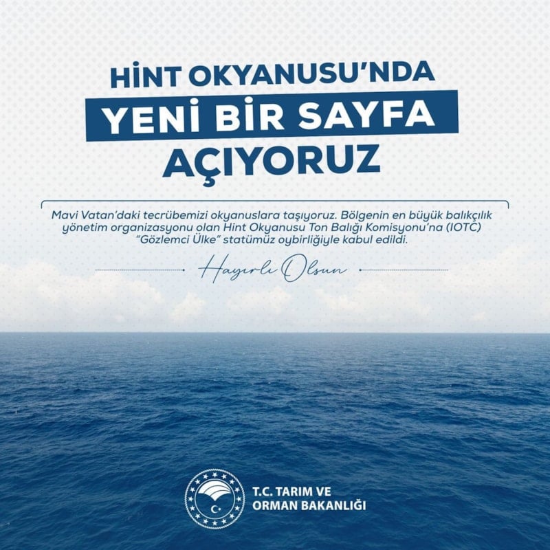 Tarım ve Orman Bakanı İbrahim Yumaklı, Türkiye'nin, Hint Okyanusu Ton Balığı Komisyonu (IOTC) nezdinde "Gözlemci Ülke" statüsünün onaylandığını ve hedefin orta vadede "Tam Üye" olarak balıkçılık filomuza yeni ufuklar açmak ve bölge ülkeleriyle stratejik iş birliklerimizi güçlendirmek olduğunu açıkladı.