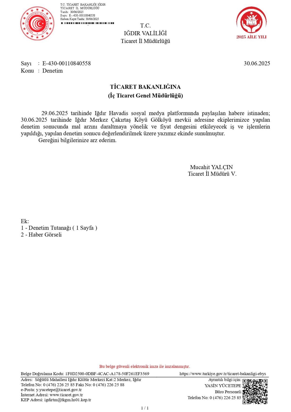 29 Haziran 2025 tarihinde sosyal medyada 'Iğdır’da kayısı 1 TL İstanbul’da 120 TL satılıyor' şeklinde yapılan paylaşımlar üzerine, Ticaret Bakanlığımızın denetim ekipleri 30 Haziran 2025 tarihinde Iğdır Merkez’de gerekli incelemeleri başlatmıştır.