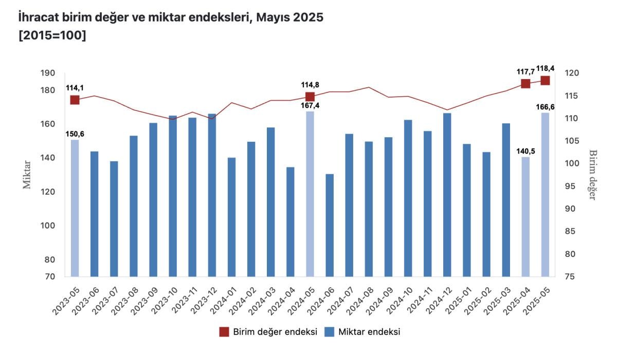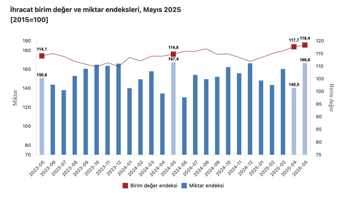 Mevsim ve takvim etkilerinden arındırılmış seriye göre ihracat miktar endeksi; 2025 Nisan ayında 143,7 iken 2025 Mayıs ayında yüzde 12,6 oranında artarak 161,8 oldu. Takvim etkilerinden arındırılmış seriye göre ise ihracat miktar endeksi; 2024 yılı Mayıs ayında 158,6 iken 2025 yılı Mayıs ayında yüzde 3,6 oranında artarak 164,3 oldu.