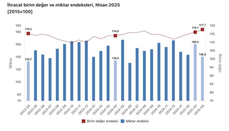 Mevsim ve takvim etkilerinden arındırılmış seriye göre ihracat miktar endeksi; 2025 Mart ayında 159,9 iken 2025 Nisan ayında yüzde 10,3 oranında azalarak 143,4 oldu. Takvim etkilerinden arındırılmış seriye göre ise ihracat miktar endeksi; 2024 yılı Nisan ayında 148,2 iken 2025 yılı Nisan ayında yüzde 5,4 oranında azalarak 140,2 oldu.