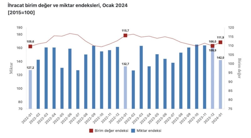 TÜİK verilerine göre ihracat birim değer endeksi ocak ayında bir önceki yılın aynı ayına göre yüzde 3,3 azalırken, ihracat miktar endeksi ocak ayında bir önceki yılın aynı ayına göre ise yüzde 7 artış gösterdi.