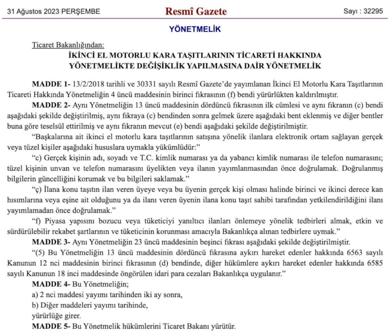 Resmi Gazete'de yayımlanan yönetmelikle birlikte ikinci el araç satışlarında ilan sitelerinde ismin gizlenerek ilan verilmesi yasaklanıyor.