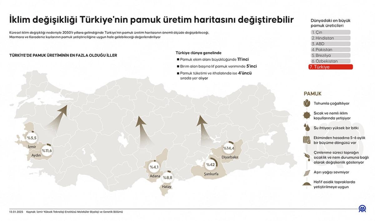 Küresel iklim değişikliği nedeniyle 2050'li yıllara gelindiğinde Türkiye'nin pamuk üretim haritasının önemli ölçüde değişebileceği, Marmara ve Karadeniz kıyılarının pamuk yetiştiriciliğine uygun hale gelebileceği değerlendiriliyor.